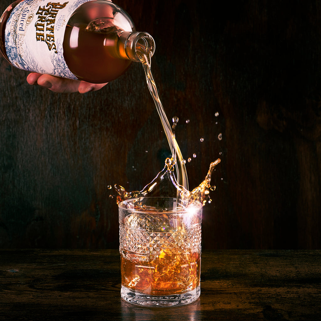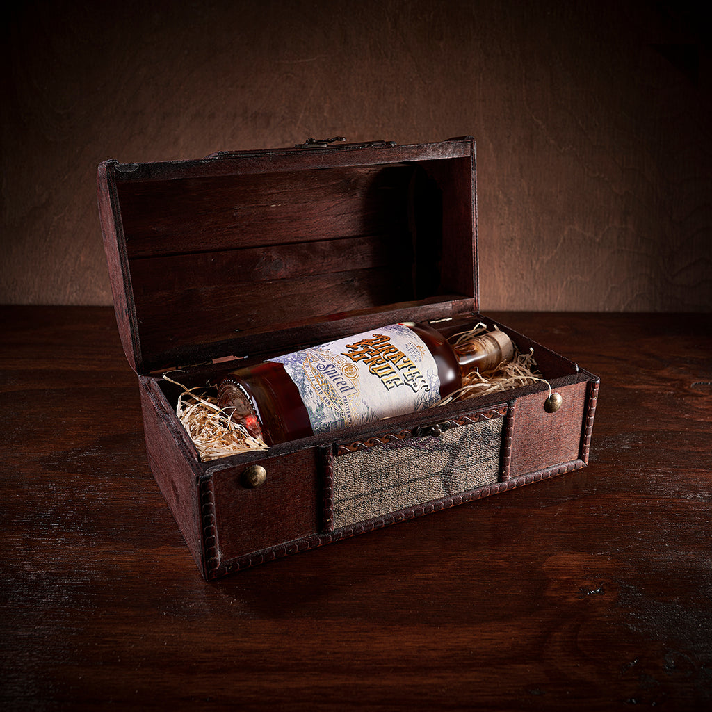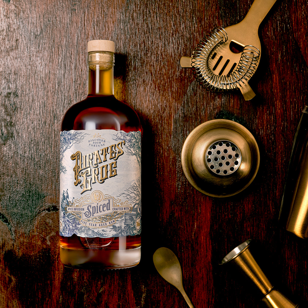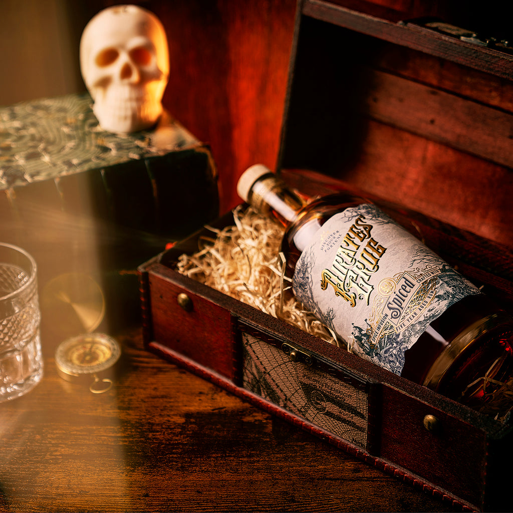 A 'bootyful' gift set for spiced rum lovers…. Pirate's Grog Spiced is an exotic infusion of salt, caramel, a touch of allspice and a secret ingredient, which can be found growing along the enchanting shores of Roatan, Honduras.
