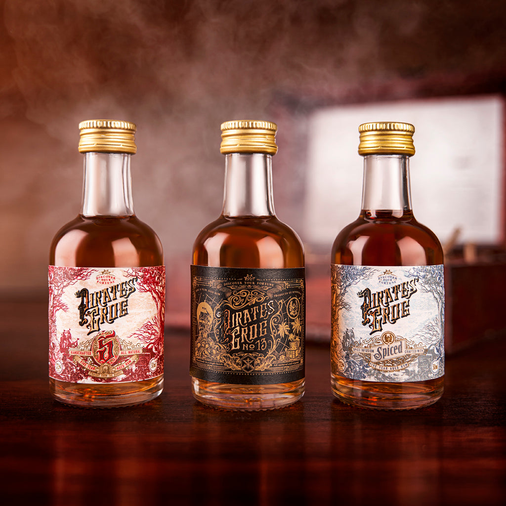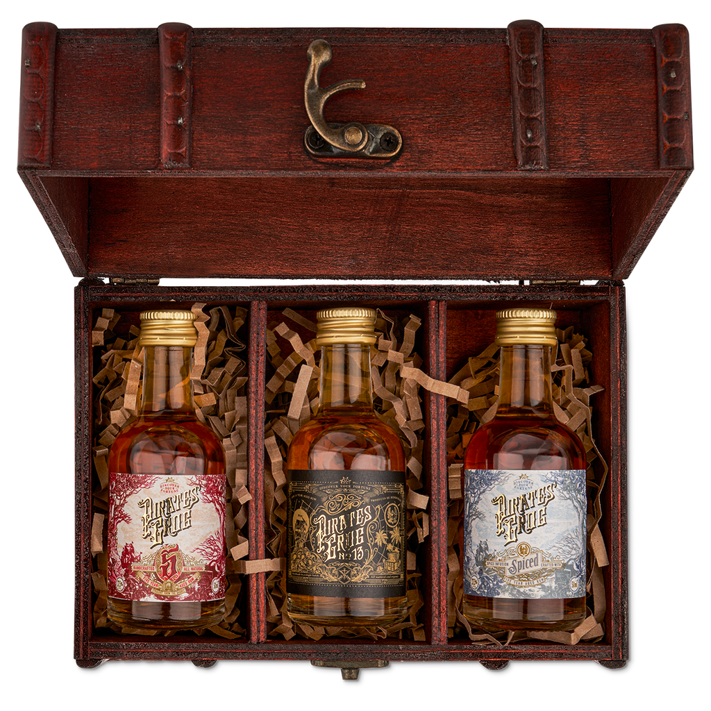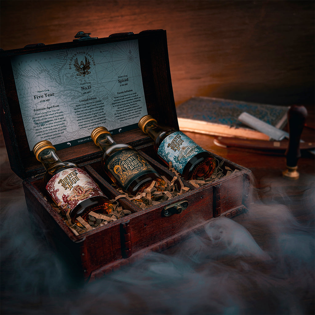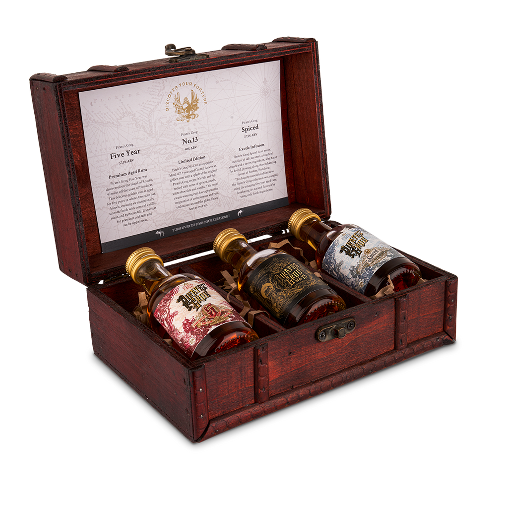 Three miniature bottles of Pirate's Grog, with a personalised wax sealed scroll, are the perfect gift to send any rum lover. This handcrafted wooden box houses all three Pirate’s Grog Rums; Pirate's Grog Five Year, Pirate’s Grog No.13 and Pirate's Grog Spiced.