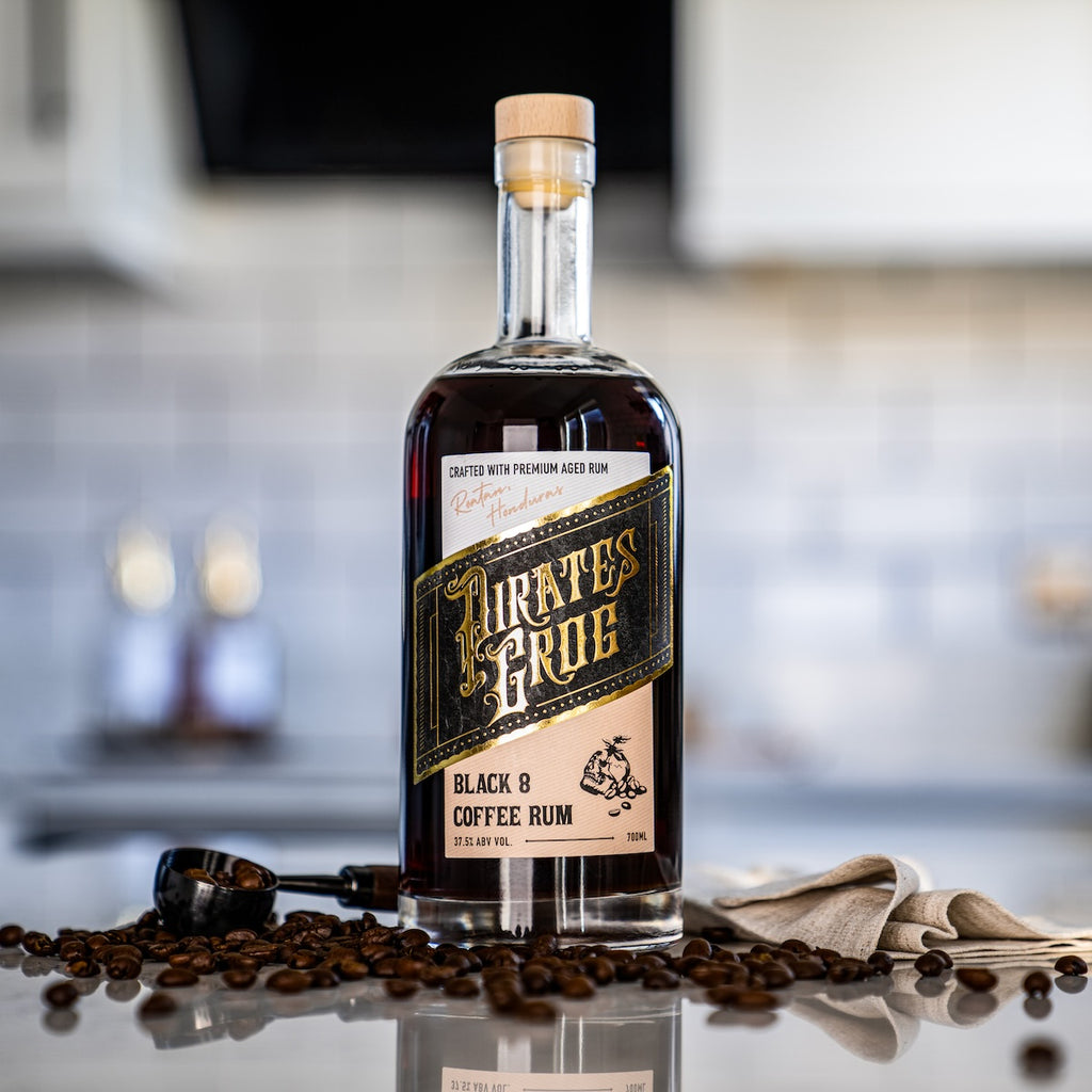 Pirate’s Grog Black 8 Coffee Rum is created by infusing premium Brazilian coffee with the incredibly smooth Pirate’s Grog Five Year aged rum. The result is an elegantly balanced blend with notes of chocolate, caramel and a hint of toffee.